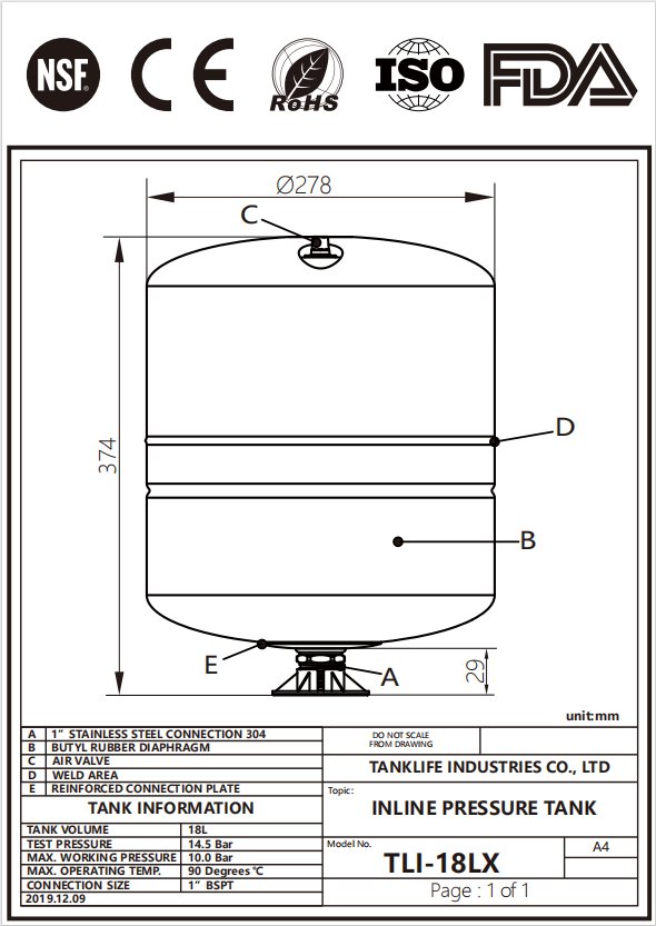 Этот резервуар для воды отличается исключительной прочностью, высокой производительностью и постоянным давлением воды. Благодаря объему в 18 литров он идеально подходит для систем с высокой потребностью в стабильном и длительном хранении воды.