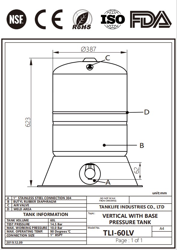 Вертикальный 60-литровый напорный бак имеет прочную конструкцию, которая обеспечивает стабильное давление воды, сокращает количество циклов работы насоса и продлевает срок его службы.
